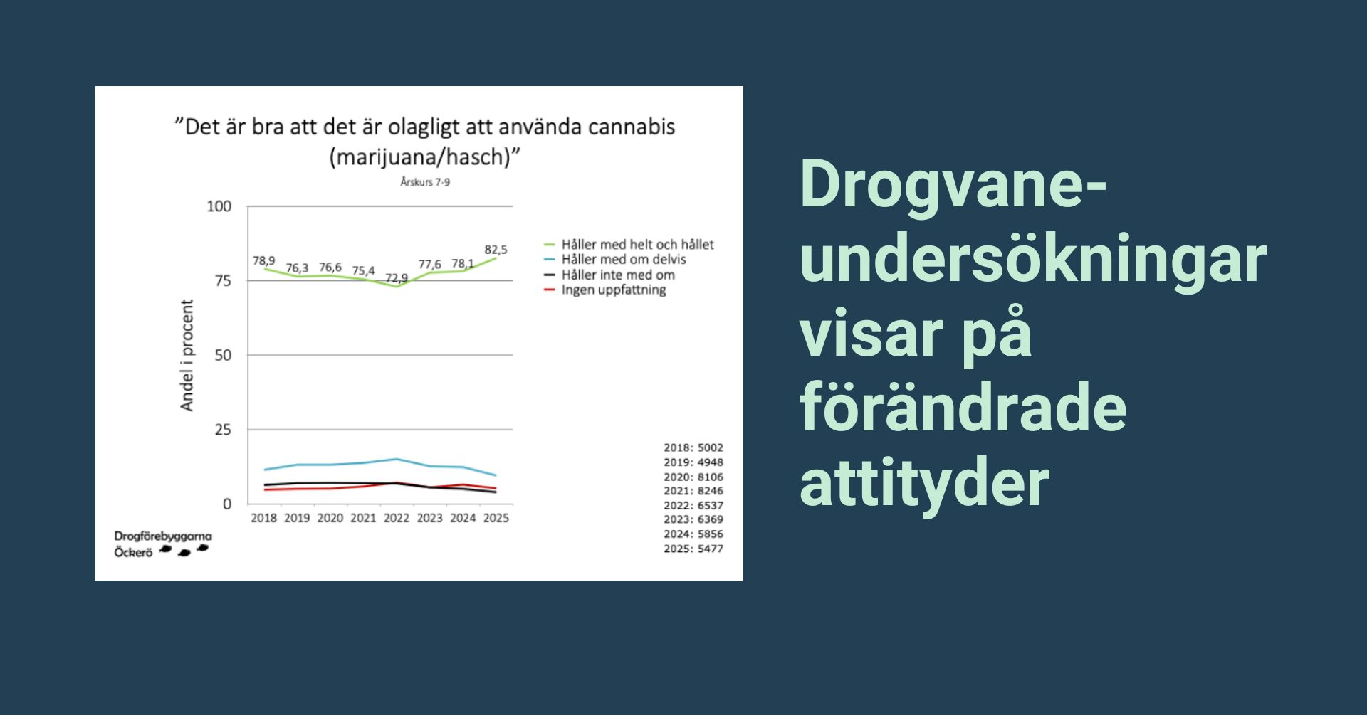 Grafen ovan visar resultaten från 15 drogvaneundersökningar som genomförts i olika delar av landet. Samtliga undersökningar visar på ett trendbrott från år 2022.